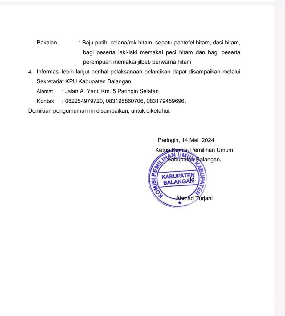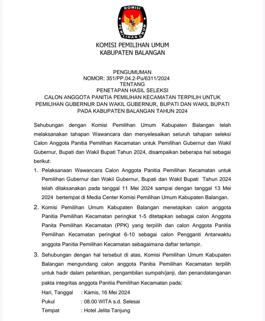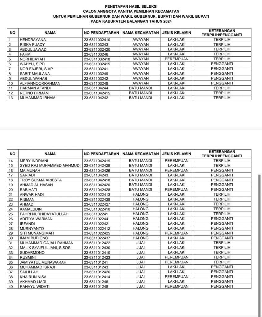 KPU Balangan Tetapkan Hasil Seleksi Calon Anggota Panitia Pemilihan Kecamatan (PPK) Untuk Pilkada 2024