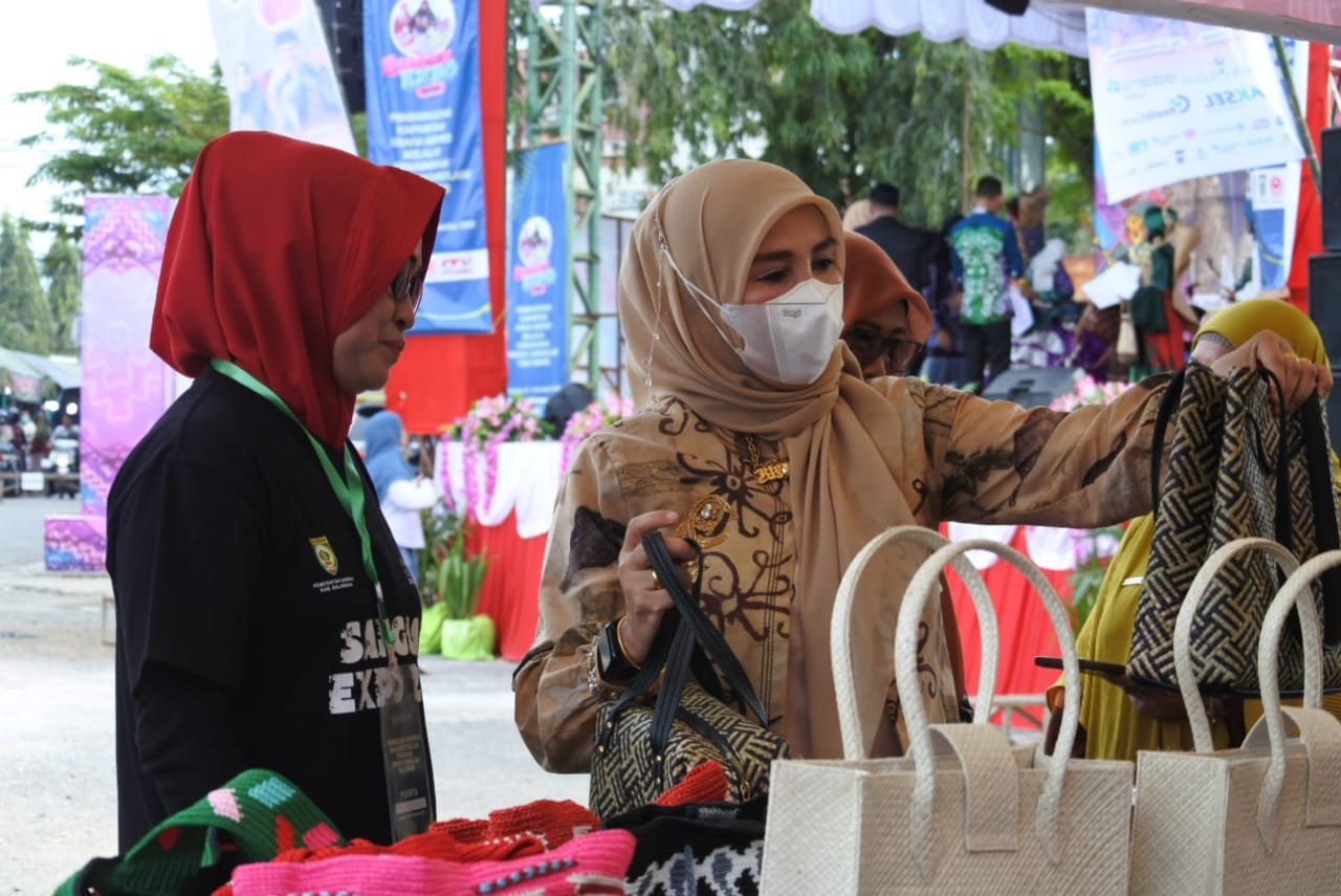 Kunjungan istri orang nomor satu di kabupaten yang berjuluk Bumi Sanggam ini, mendapat sambutan hangat dari para peserta Sanggam Expo.