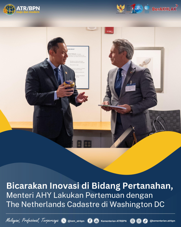Pengembangan sistem administrasi pertanahan di Indonesia dengan memanfaatkan digitalisasi serta inovasi baru lainnya, menjadi fokus pertemuan antara Menteri Agraria dan Tata Ruang/Kepala Badan Pertanahan Nasional (ATR/BPN) Agus Harimurti Yudhoyono (AHY) dengan The Netherlands Cadastre di Washington DC pada Selasa (14/05/2024) waktu setempat.