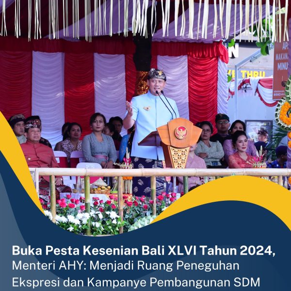 Bali – Menteri Agraria dan Tata Ruang/Kepala Badan Pertanahan Nasional (ATR/BPN), Agus Harimurti Yudhoyono (AHY) berkesempatan membuka Pesta Kesenian Bali (PKB) XLVI Tahun 2024 pada Sabtu (15/06/2024). Saat membuka acara, ia mengatakan bahwa PKB XLVI ini selaras dengan upaya mewujudkan Indonesia Emas 2045.