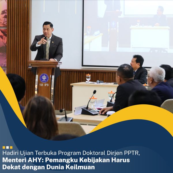 Bogor – Menteri Agraria dan Tata Ruang/Kepala Badan Pertanahan Nasional (ATR/BPN), Agus Harimurti Yudhoyono (AHY) menghadiri Ujian Terbuka Doktor Direktur Jenderal Pengendalian dan Penertiban Tanah dan Ruang (PPTR), Jonahar pada Senin (30/09/2024). Kehadiran Menteri AHY merupakan bentuk dukungan kepada jajaran karena baginya, pemangku kebijakan penting untuk dekat dengan ilmu pengetahuan.