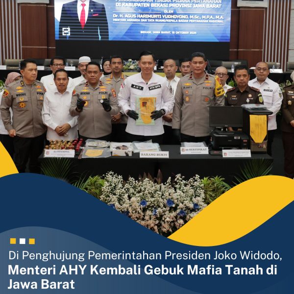 Kab. Bekasi – Masa pemerintahan Presiden Joko Widodo akan berakhir dalam hitungan hari. Di penghujung masa pemerintahan ini, Menteri Agraria dan Tata Ruang/Kepala Badan Pertanahan Nasional (ATR/BPN), Agus Harimurti Yudhoyono (AHY) kembali menggebuk mafia tanah dengan mengungkap dua kasus tindak pidana pertanahan yang terjadi di Kabupaten Bekasi, Jawa Barat.