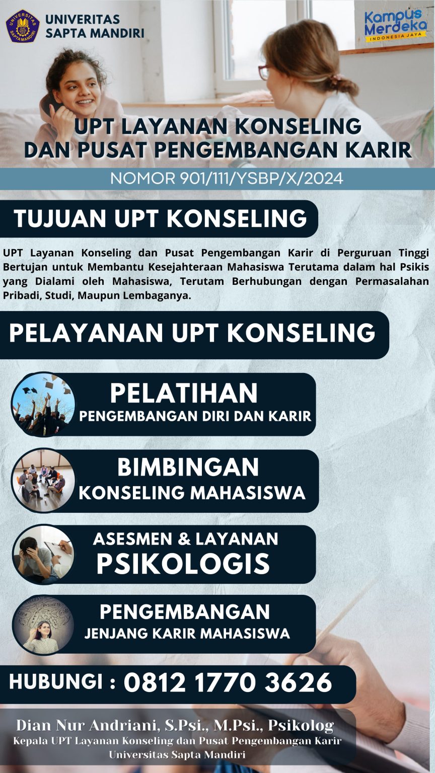Untuk memastikan layanan berjalan optimal, pihak kampus menunjuk psikolog Dian Nur Andriani sebagai penanggung jawab UPT. Melalui unit ini, mahasiswa dapat memperoleh pendampingan individu maupun kelompok terkait masalah pribadi, studi, hingga perencanaan karier.