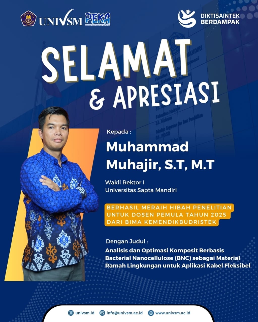 Balangan – Prestasi membanggakan kembali diraih Universitas Sapta Mandiri (UnivSM). Muhammad Muhajir, S.T., M.T., yang saat ini menjabat sebagai Wakil Rektor I, berhasil memperoleh Hibah Penelitian untuk Dosen Pemula Tahun 2025 dari BIMA Kemendikbudristek.