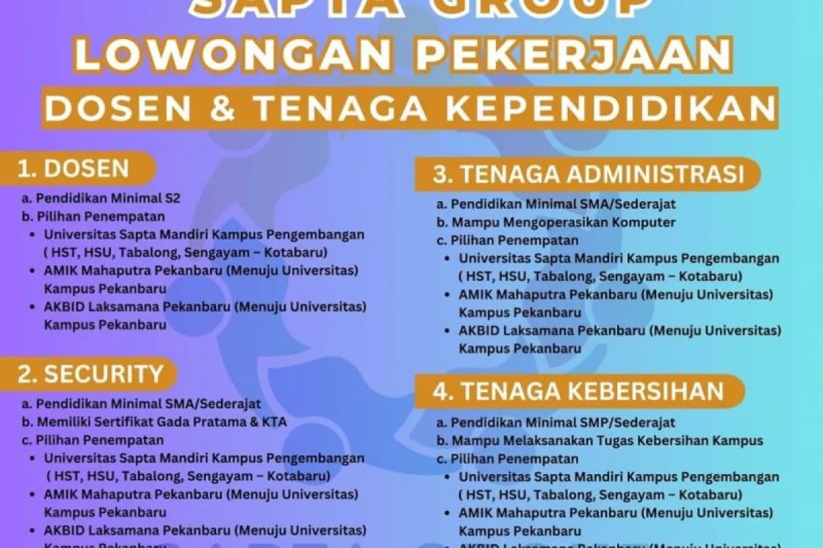 Balangan, 23 Juni 2025 – Sapta Group–Universitas Sapta Mandiri (Univsm) Balangan, Kalimantan Selatan, kembali membuka kesempatan kerja bagi masyarakat yang ingin bergabung sebagai bagian dari institusi pendidikan yang terus berkembang.